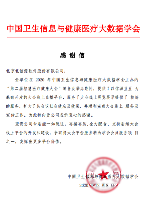 12月1日,第二届中国聪明健康医疗年夜会在上海隆重揭幕。全国人年夜陈竺副委员长、上海市卫健委邬惊雷主任、中国科学院李兰娟院士、中国老年保健医学研讨会高松柏会长、上海市卫健委赵丹丹副主任、中国卫生信息与健康医疗年夜数据学会金小桃会长分辨经由过程现场或视频方法致辞。本次年夜会由中国卫生信息与健康医疗年夜数据学会主办,北信源作为年夜会支撑单元,供给了以信源豆豆为基本开辟的年夜会线上直播平台,为年夜会线上展览展现供给了较好的平安即时通信办事,扩展了本次会议的社会效应及后果,协助年夜会顺遂完成线上办事及宣扬工作,并获得年夜会及参会职员的高度承认与赞誉。